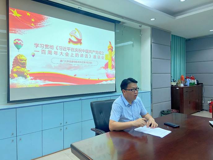 信息学院本科生第3党支部积极响应厦门大学关于召开党史学习教育的号召,于2021年7月12日开展以“学习贯彻习近平在庆祝中国共产党成立一百周年大会上的讲话”为主题的座谈会。本次会议于海韵行政楼A306举行,党支部22名党员参加了此次活动。会议由党支部书记熊剑龙主持。