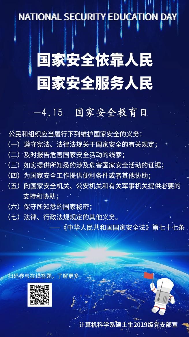 2021年4月18日,为响应“国家安全教育日”号召,信息学院计算机科学与技术系硕士生2019级党支部在线上以及线下举办了“国家安全教育日”主题党日活动,支部全体党员共同参与。