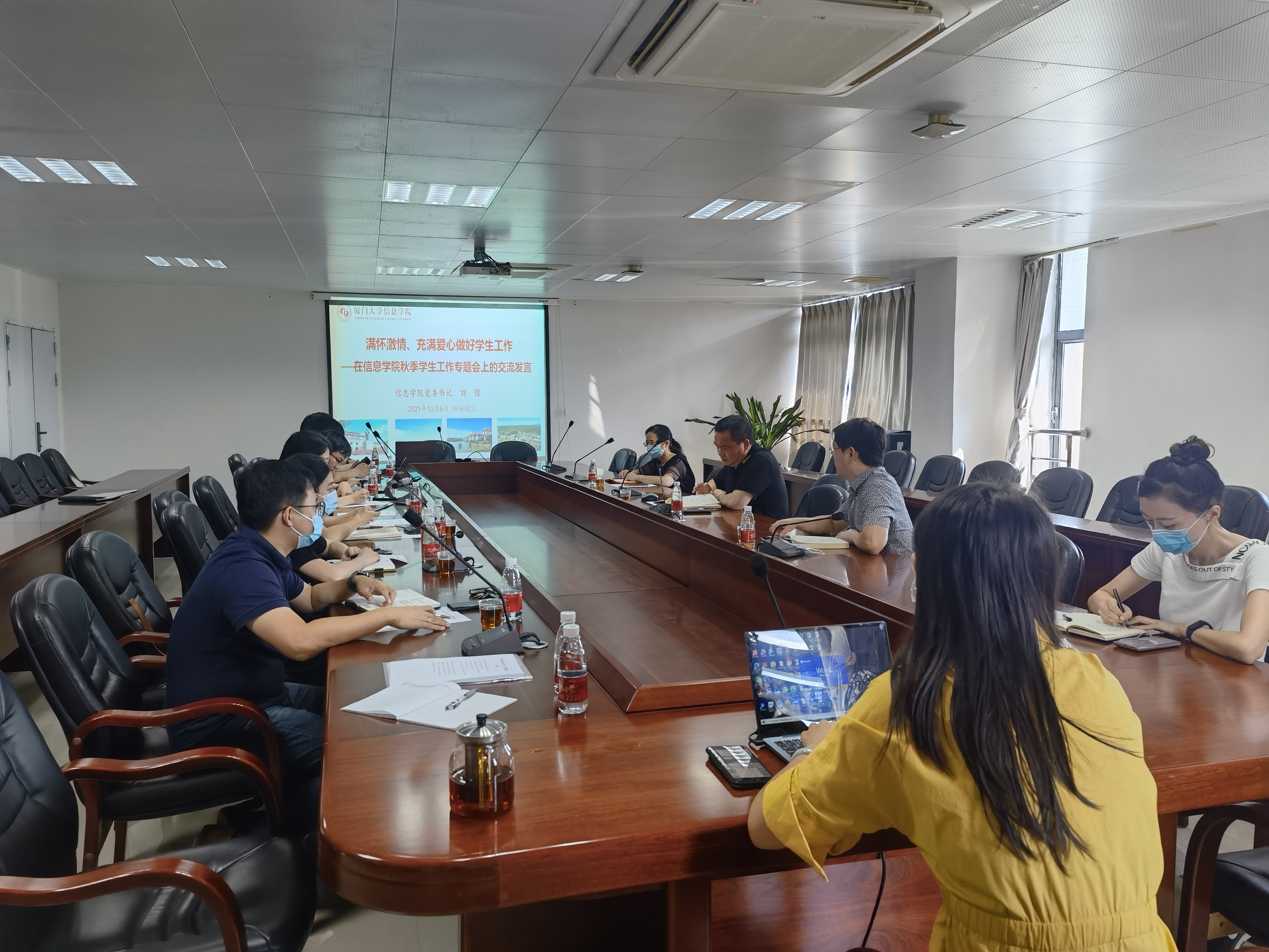 10月6日上午,信息学院秋季学生工作专题会于翔安校区学生活动中心A201召开,学院党委书记刘弢、党委副书记郑镇锋、龙坚毅以及全体辅导员参加会议。