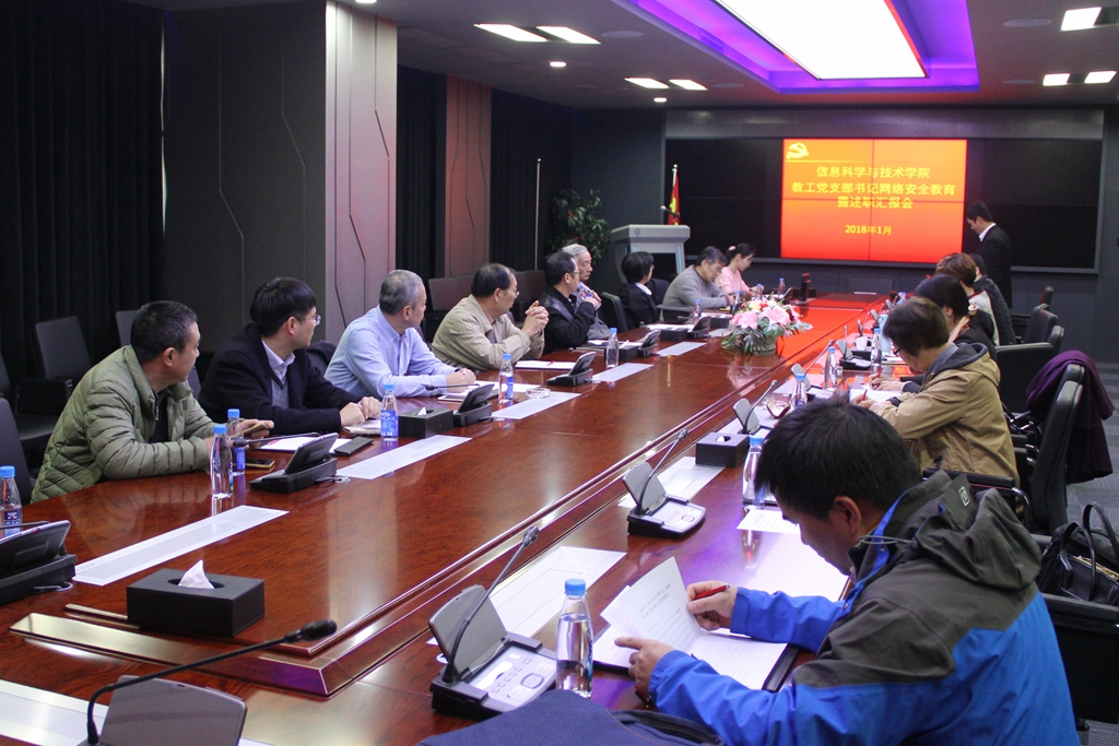 2018年1月18日下午3点,信息学院教工党支部书记网络安全教育暨述职汇报大会于美亚柏科信息股份有限公司培训中心17楼会议室隆重召开。信息学院党委书记黄鸿德,副书记李承华,党委委员、办公室主任杨蔷,教工支部书记及支部委员,工会、团委、民主党派代表参加了述职大会。校关工委副主任张兴国,信息学院关工委副主任陈道乾,组织部组织员姚有新应邀参会。会议由党委书记黄鸿德主持。