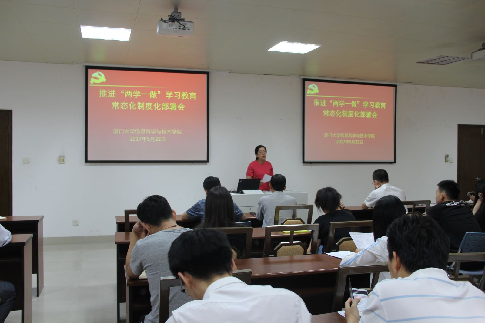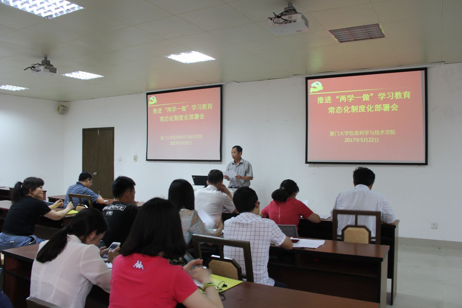 5月22日下午,信息学院召开推进“两学一做”学习教育常态化制度化工作部署会。学院党政领导、党支部书记、辅导员及党务秘书参加会议。会议由学院党委书记黄鸿德主持。