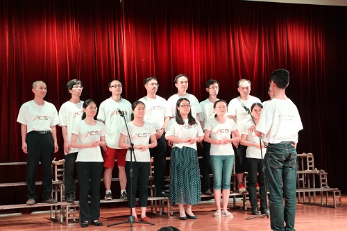在正式比赛开始前,作为嘉宾出席的十余名计算机科学系老师首先为同学们献唱了一首优美婉转的《茉莉花》。老师们身着整齐的队服令人眼前一亮,原本在同学们眼中是严谨治学的老师们此刻一改平日印象,活泼的合唱形式、优雅嘹亮的歌声让场下的欢呼声和掌声不断,现场氛围热烈火爆。