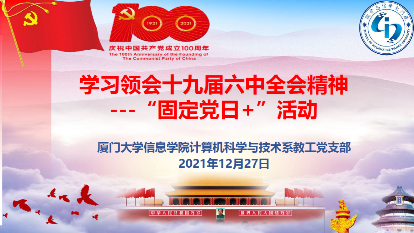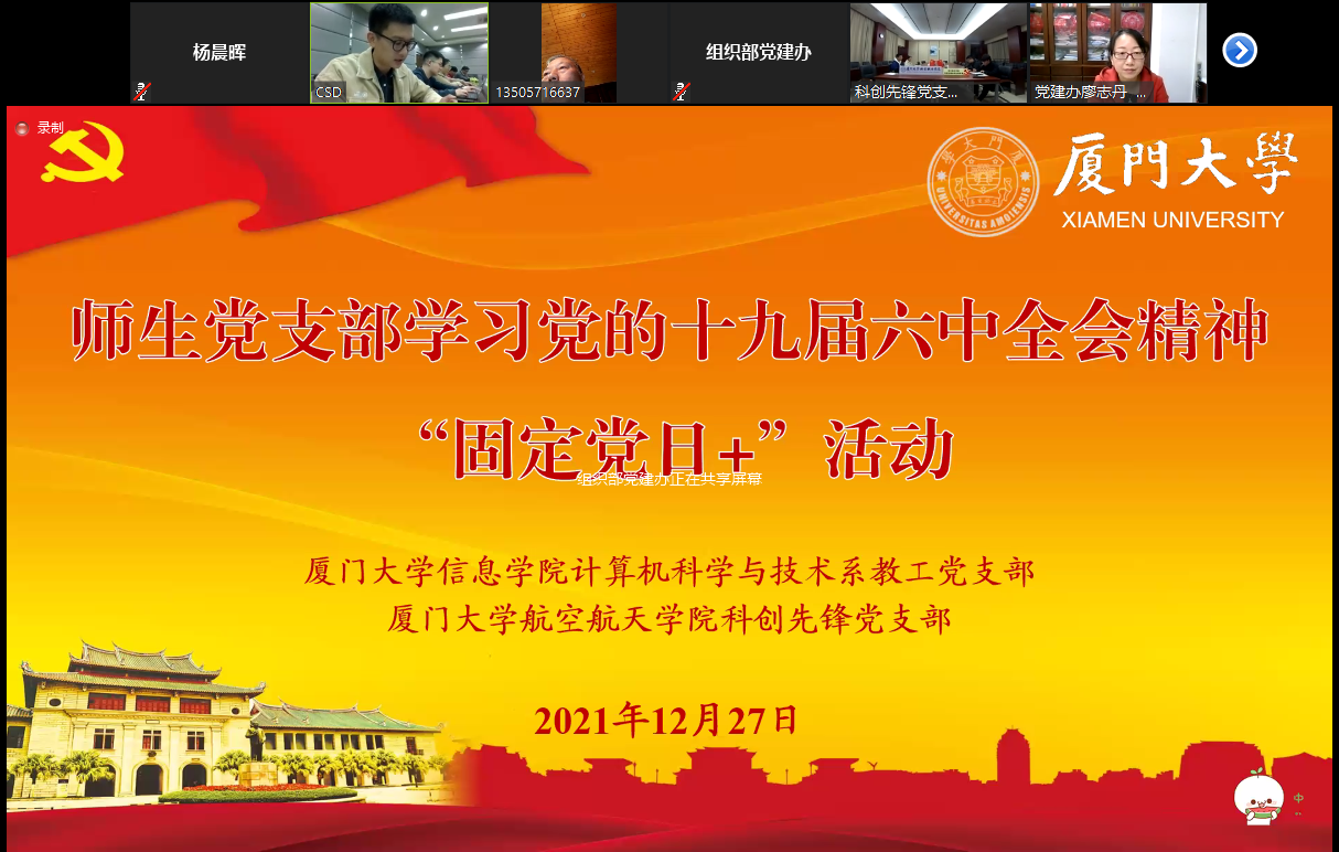 12月27日晚,信息学院计算机科学与技术系教工党支部联合航空航天学院科创先锋本科生党支部举行联合“固定党日+”活动,深入学习领会十九届六中全会精神。教育部直属高校党建工作联络员陈子辰,厦门大学党委党的建设办公室主任兼组织部副部长、教师工作部副部长廖志丹通过视频在线参加会议。