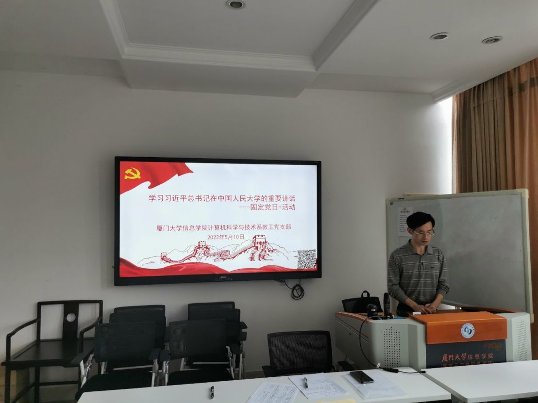 2022年5月10日下午,计算机科学与技术系教工党支部在行政楼C414召开“固定党日+”活动,集体学习习近平总书记在中国人民大学考察时的重要讲话。会议由支部委员黄晓阳同志主持。