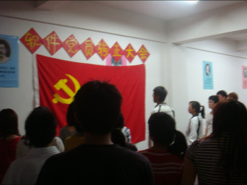 大会在庄严的党旗下,伴随着国际歌声拉开了序幕。会议进行了三项议程,为一名预备党员召开了转正大会,听取了6名预备党员的半年汇报和党员联系人对所有积极分子本季度的考察情况。本次大会结合本阶段创先争优的成果,围绕同学们作出的承诺以及各方面的表现展开了详细的汇报和充分的讨论。按照汇报一个讨论一个的原则,与会的同学们认真地听取汇报,积极提出自己的意见和建议,真诚地展开批评与自我批评,场面十分热烈。