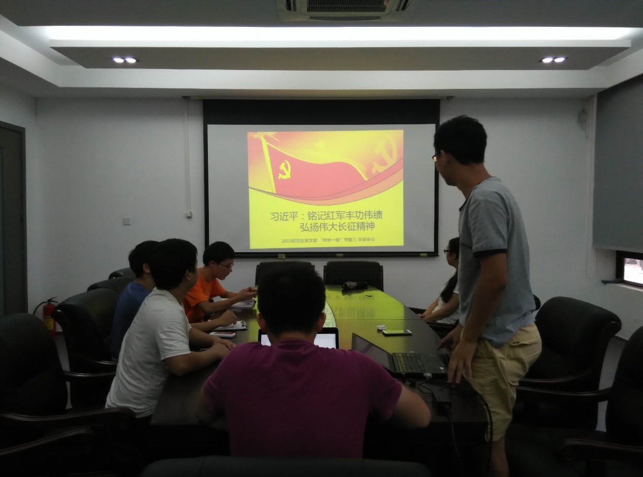 首先,全体党员以两人一组为单位,学习习近平总书记系列重要讲话,并分享了自己的心得体会。潘洋彬同志和李纯凤同志小组学习了总书记指出的“党员要发挥先锋模范作用,在同重大自然灾害的斗争中经受住考验”,并且结合台风“莫兰蒂”表达了自己所见所感。罗威臻同志和谢凌伟同志小组针对“为建设世界科技强国而奋斗”发表了自己的感想。他们提出,我们应扎实做好科研工作,提高科研能力,为建设科技强国贡献自己的一份力。傅中杰同志和陈志勇同志学习了习近平总书记在二十国集团领导人杭州峰会上的闭幕辞,分析了二十国集团经济合作论坛的重要性及对世界的影响。最后,赵恒恒同志和王嘉珺同志积极响应总书记的号召,“铭记红军丰功伟绩,弘扬伟大长征精神”。