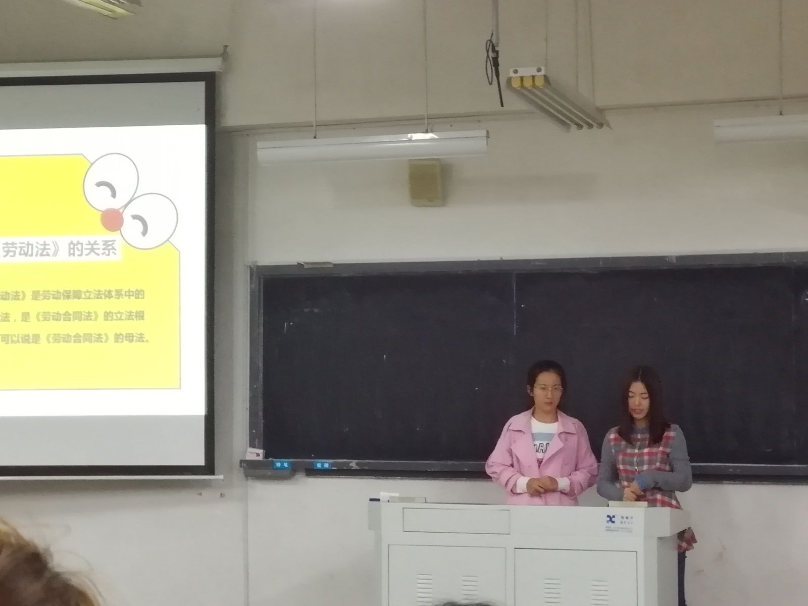 吴晶同学和武戈同学给大家讲述了《消费者权益保护法》、《劳动合同法》、《中华人民共和国高等教育法》、《献血法》、《专利法》等法律。