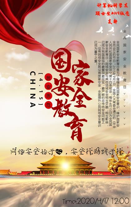 国家安全,关乎你我!每年的4月15日是国家安全教育日,全民国家安全教育日是为增强全民国家安全意识,维护国家安全而设立的节日。网络安全与其它领域安全相互交融,相互影响,已成为我国面临的最复杂最现实,最严峻的非传统安全问题之一,没有网络安全就没有国家安全,全面提高公民网络安全意识已成为重中之重!为深入贯彻“总体国家安全观”,信息学院计算机科学系硕士生2019级党支部开展4月份党支部“信息安全之路”立项系列活动。