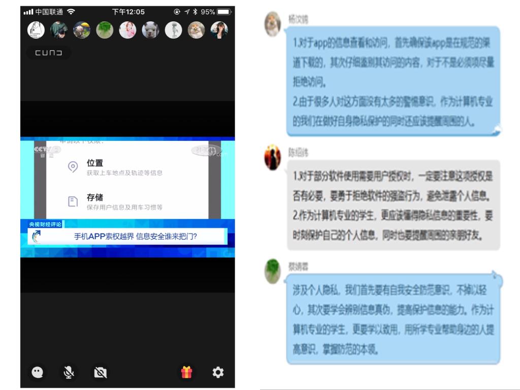2020年4月17日中午,支部于线上组织开展了以安全教育为主题的“固定党日+”党课。党课的主要内容是学习国家安全之网络安全——《〈央视财经评论〉手机APP索权越界 信息安全谁来把门?》。支部全体党员集中线上观看,了解当前手机下载APP存在的信息安全风险,增强信息安全的防范意识,掌握防范信息泄露的本领。支部党员围绕“疫情期间如何保证信息安全”话题积极参与讨论,一致认为应该发挥计算机专业优势,提高警惕,积极宣传,防范风险。