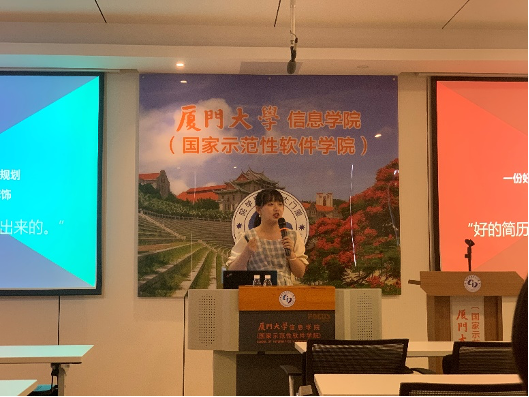 2021年6月8日下午,由厦门大学就业创业指导中心和信息学院联合主办“职上青云”系列分享会在海韵园行政楼C505顺利举办。浙江大学管理学硕士、现任华为公司资深校园招聘经理颜淑倩女士给同学们带来了精彩的简历撰写和面试技巧的分享与指导。活动由2020级硕士生刘姝嫔主持。