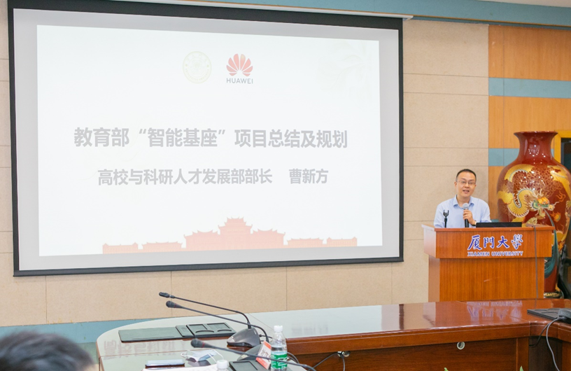 ▲华为高校科研与人才发展部长曹新方介绍教育部“智能基座”整体进展及规划