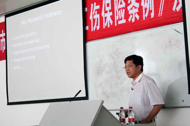 2012年5月11日上午10:00,在海韵行政C505报告厅,中国科学技术大学教授刘利刚教授开展了一场主题为几何驱动的图像处理的报告。报告开始,刘利刚教授先总体介绍自己的研究兴趣:计算机图形学,几何建模与处理,图像处理等和团队,然后详细介绍如何运用几何背景来进行图像处理,其中以四个图像处理的例子:内容保持的图像缩放,照片构图优化,人体轮廓重塑,画图顺序恢复来深入浅出的揭示曲面采点,网格生成,几何建模,几何能量优化等知识在图像处理中的的运用,刘利刚教授还回答了现场师生关于如何建立人体模型,三个规则权值设定等问题,刘教授的报告严谨认真,生动有趣,带我们领略了一个全新的几何图形世界,本次报告在热烈的掌声中圆满落幕。(信息学院宣传中心 汪恒一)