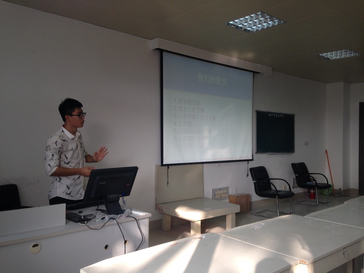 然后是互动环节,班长刘岩主持提出了几个关于学风的问题,让大家说说看法:1.怎么和老师在课堂上互动2.在课堂上吃东西是否合适3.有的同学只带着手机去上课,不记笔记是否合适4.上课玩手机的现象5.上课许多人坐后排6.上课随意进出教室7.实验课去的同学少。对此,卢宇同学发表看法:大学上课与高中是不同,大家都比较随便,可以玩可以不听课,但要遵守一条原则:上课老师讲的东西要学会;李克森同学表示:要提高课堂效率,提高上课的积极性,少玩手机,少吃零食,这样就能在课余时间做更多自己想做的事;刘安娜同学说到:大学上课玩手机无可厚非,但不要太频繁,少随意进出,如果有急事,从后门进出,这样能减少影响其他的同学,但最重要的是同学们自己要有自觉性;李天宇同学认为:想玩手机的可以坐到后面,这样想听课的可以安心听课,老师讲课也有激情;最后班长补充说:尽量少在教室里面吃早餐,要吃的话应该在室外吃完后再进教室。随后,班长刘岩简要介绍了一下学校以及学院的基本概况,并希望大家能了解牢记我们的学校、学院的基本信息。