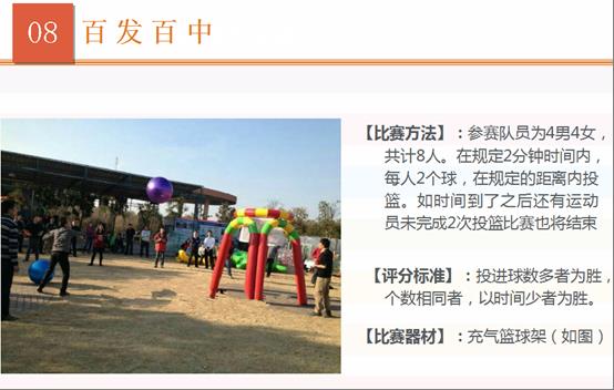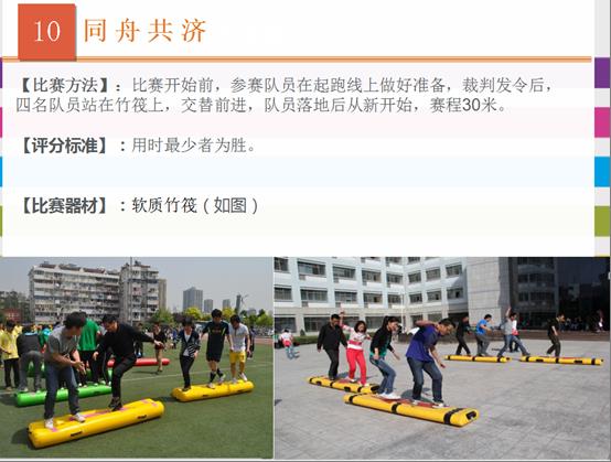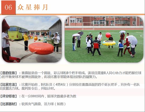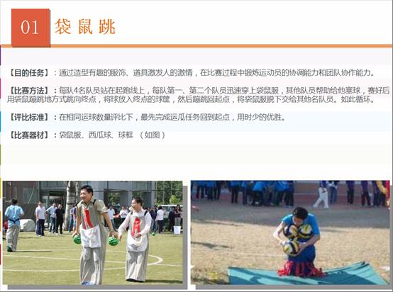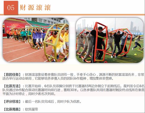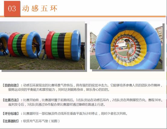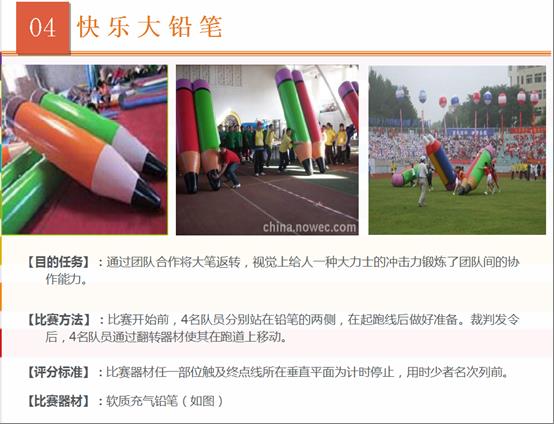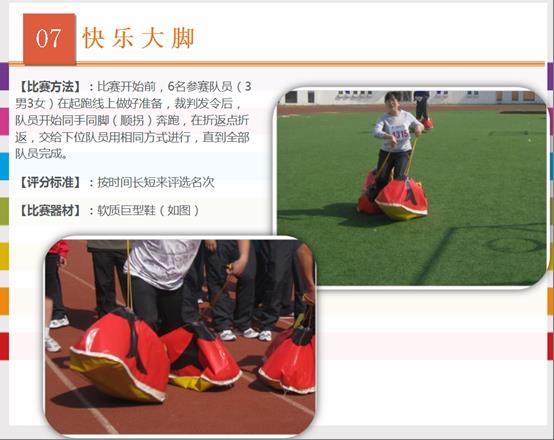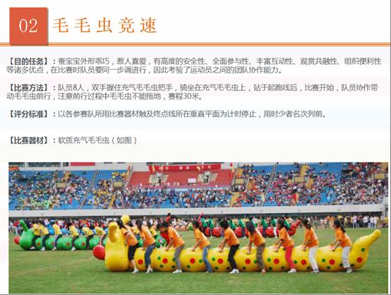 3.竞赛项目:袋鼠跳、毛毛虫竞速、动感五环、快乐大铅笔、财源滚滚、众星捧月、快乐大脚、百发百中、运转乾坤、同舟共济、九宫足球