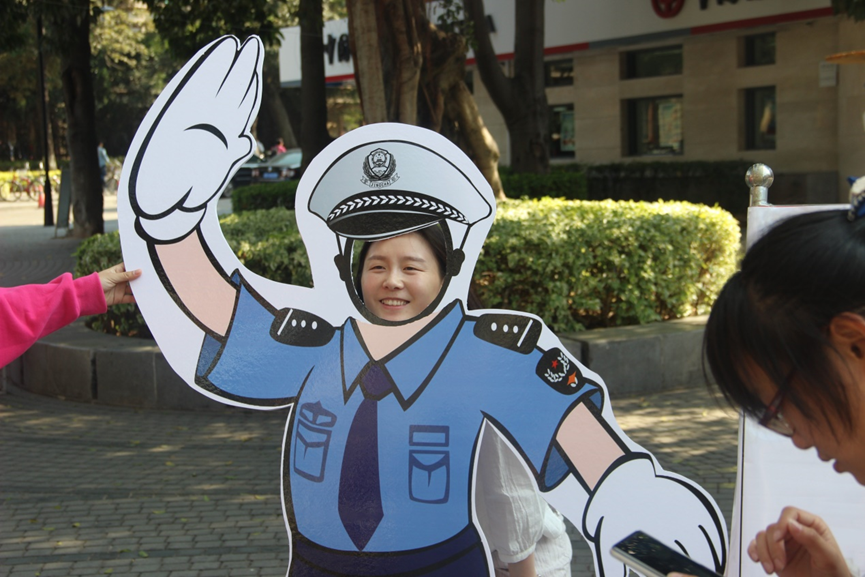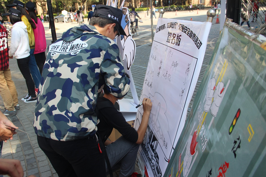 在欢声笑语中,志愿者摆好了桌椅帐篷,以及精心准备的道具。在服务点安排好之后,一场文明宣导宣传之旅开始了。活动主要分为三部分。第一部分是软件学院青年志愿者协会通过线上平台——“厦软年华”微信公众平台及时发布交通安全宣传文,志愿者们通过线下的宣传,让同学们参与到我们的互动平台,通过关注“厦软年华”微信公众号,转发相关的交通安全内容至朋友圈,让更多人了解交通安全的重要性。活动的第二部分是志愿者引导关注及转发交通安全内容至朋友圈的同学在签名版上留下自己关于交通安全的见解并签名。活动的第三部分是“你画我猜”的小游戏以及 “我是交警”拍照区留念活动。身兼青年志愿者与义务交警队员双重身份的软院学子们向来往的老师、学生、游客等喊出“让爱有家,文明出行”的口号,号召更多的人关注文明交通,从我做起,共建和谐社会。活动现场,同学们积极踊跃的参与其中,温暖的阳光打在每一个志愿者的脸庞上,幸福洋溢。