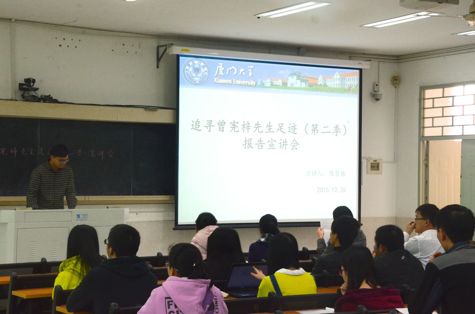 为进一步弘扬曾宪梓先生赤诚的爱国情怀和尊师重教、倾力回报祖国、回报社会的无私奉献精神,培养当代大学生高尚的情怀,12月27日下午,以“不做精致的利己主义者”为主题的厦门大学“追寻曾宪梓先生足迹(第二季)”活动宣讲报告会在学生公寓301教室顺利举行,宣讲会由陈黎栋同学主持,我院2014级本科生党支部参加了此次宣讲会。