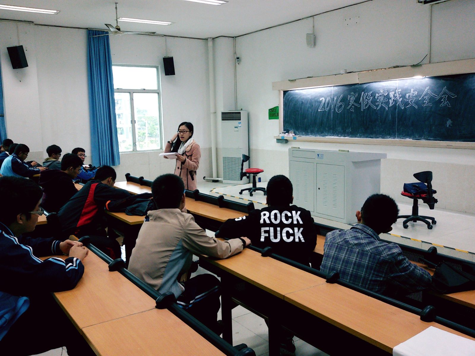 2016年1月15日早上10:30,在学生公寓204教室,今年寒假社会实践安全动员大会如期召开。这次会议由软件学院实践部举办,兼职辅导员史丽峰主持,今年的16支院级社会实践队伍队长及队员代表参加了会议。