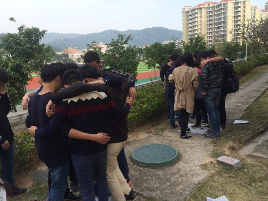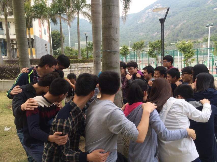 最后的游戏是全体人员围成一个圈,素拓师播放一首歌,规定出现某个歌词大家要一起做相应的动作。在几分钟的时间里,同学们一会是前一个人坐在后一个人的腿上,一会儿是转身换方向,一会儿又是拍手,手足无措,虽筋疲力尽,却也引来了许多欢声笑语。