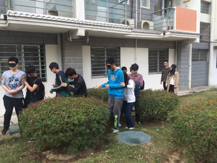 活动在下午2点准时开始。首先进行的是一个团队心理游戏,全体人员分成两组进行一对一配对,两个人中一人戴眼罩,另一个人指引他前往活动目的地,在此过程中都不能发出声音。在素拓师的引导下, “盲人”将害怕转变为对同伴的信任,畏畏缩缩的步伐慢慢变成从容的大踏步。经过千辛万苦,走过磕磕绊绊的道路,全体人员最终都到达了目的地。