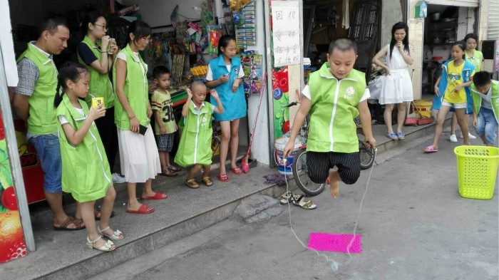 7月3日上午10时30分,活动的第二个环节“出任务”即将开始,孩子们跃跃欲试。每个家庭都需分别完成两个任务点的任务后返回报道,这两个任务分别为找路人踢毽子和在指压板上跳绳。看着孩子们急切地奔跑在路上的样子,家长也不由地跑了起来,就这么齐头并进,一起为了任务而努力。