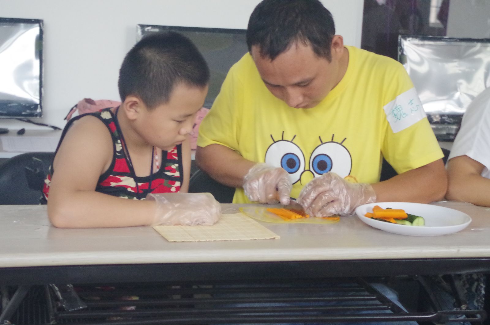 经过体力活动和智力活动之后,大家早已经饥肠辘辘,迫不及待地想要吃大餐呢。但是呢,自力更生丰衣足食。为了填饱肚子,我们又进行了“亲子寿司”活动。
