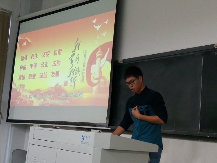 软件学院2016级4班团支部于10月28日下午16点30分在海韵教学楼206开展了“践行社会主义核心价值观”主题团课。本次团课由团支书郑英林主持,同学们青春洋溢,齐聚一堂,认真学习了社会主义核心价值观,热情活泼的场面是4班的全体同学青春活力的剪影,研精致思的举动是他们仔细认真的体现。