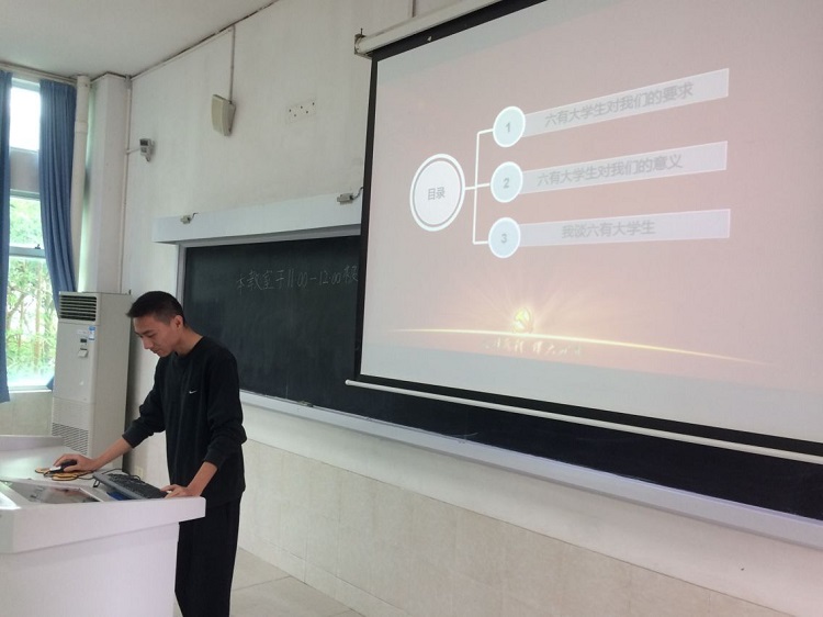 团支书艾星首先介绍了团课的主要流程。随后,他向大家概括的介绍了六有大学生的主要内容以及对我们的要求,并呼吁大家在日常生活中践行六有大学生的要求,争取从小事做起,从点滴做起。接下来,他配合时事向大家逐条介绍了六有大学生的内容,加深了同学们对六有大学生的认识。