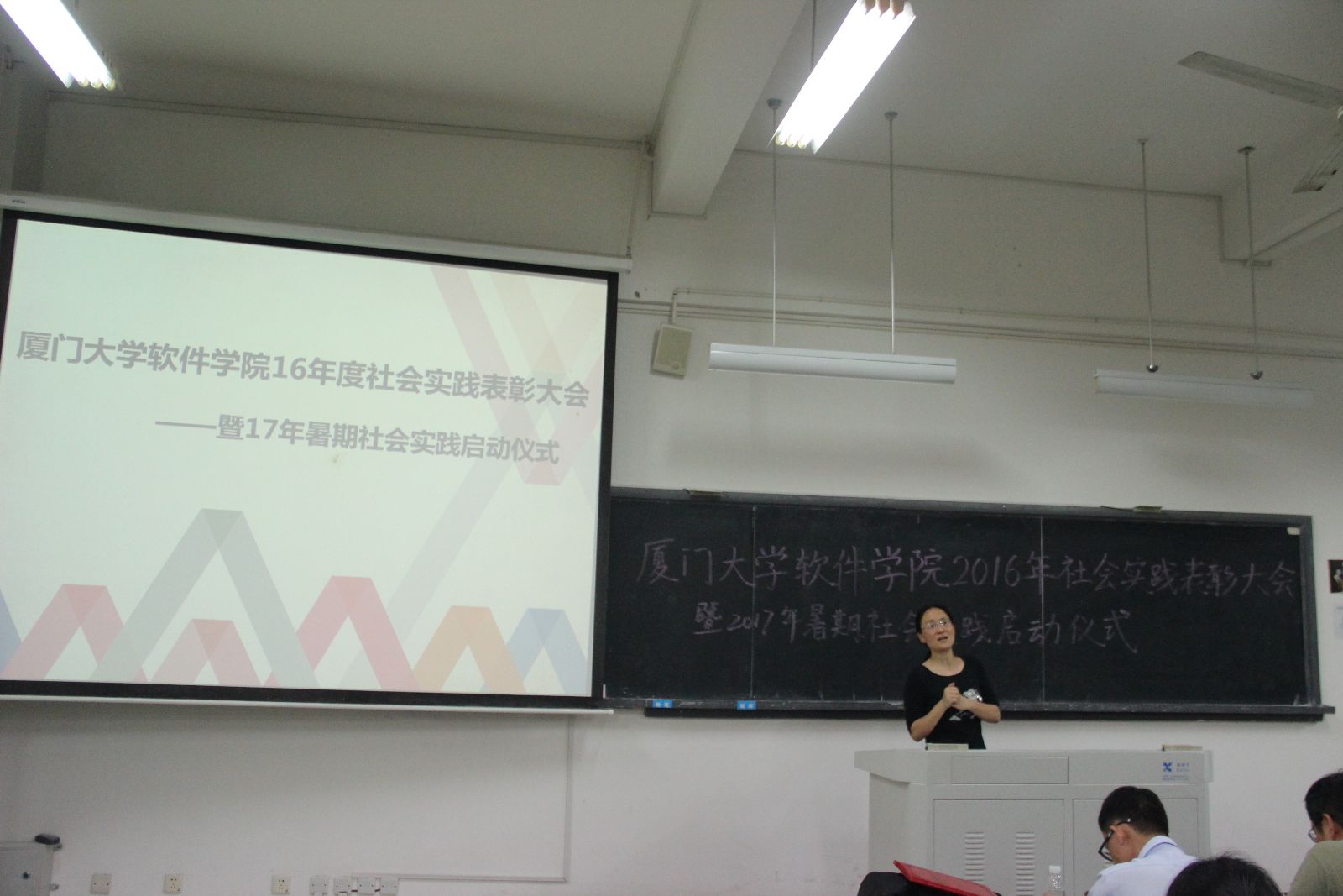 2017年5月12日晚19:00,软件学院2016年社会实践总结表彰暨2017年暑期社会实践启动大会在海韵教学楼302教室举行。软件学院党委副书记刘钟南老师,数字媒体工程系林俊聪老师,软件工程系邱明老师,学院团委书记葛学凤老师,团委副书记李加冕老师以及受表彰学生和各年级学生代表参加了大会。