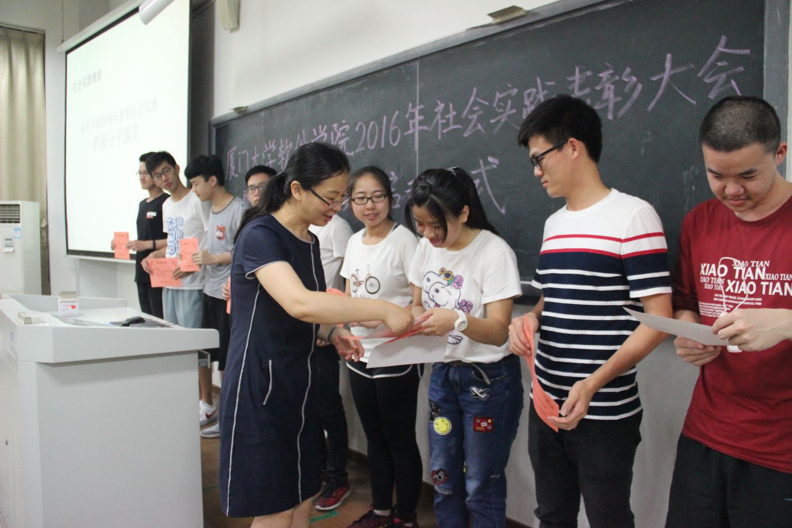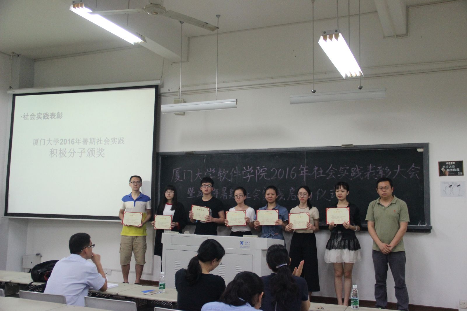 大会以软件学院2016年社会实践活动视频作为开篇,展示了一年以来学院学生社会实践精彩多样的活动主题、充实丰富的实践内容和硕果累累的实践成果。会上为暑期社会实践、寒假社会实践的校级、院级优秀调研报告、优秀团队、积极分子以及优秀带队老师颁奖。在过去一年里,软件学院共组织了50支暑期社会实践队和11支寒假社会实践队,1名老师获评福建省社会实践活动先进工作者,2名同学获评福建省社会实践活动先进个人,5名老师获评厦门大学优秀带队教师,1份调研报告获评厦门大学2016年暑期社会实践优秀调研报告,5支实践队获评厦门大学暑期社会实践优秀团队,37名同学获评厦门大学暑期社会实践积极分子。同时学院还评出了5支院级暑期社会实践优秀团队,3支院级寒假社会实践优秀团队,38名院级暑期社会实践积极分子和15名院级寒假社会实践积极分子。学院对获得校级和院级表彰的团队还给予了一定奖金奖励。