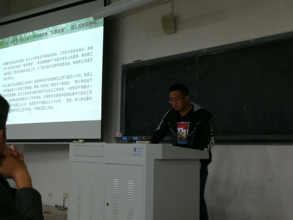 第五组成员夏一帆、肖昶辉、吴挺、吴帅同学则介绍了几种生活中常见的法律,如网络安全法,劳动法,未成年人保护法等,向大家普及了一些可能遇到的问题和解决方法,以及在生活中如何学以致用,用法律保护自己武装自己,为了社会主义和谐社会的伟大目标积极奋斗!
