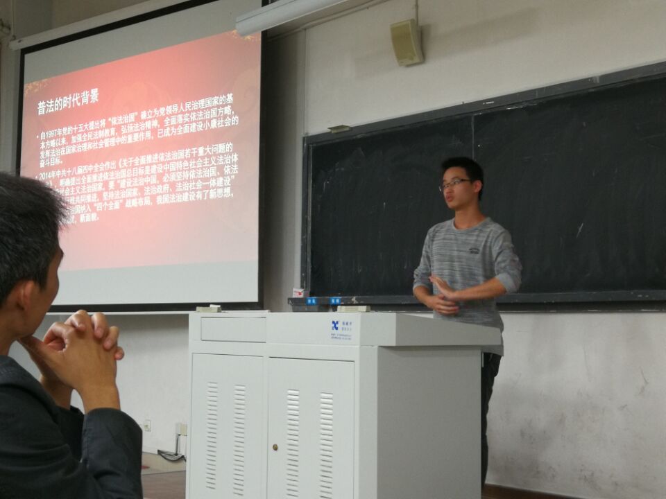 杨博同学带领小组成员对“普法的时代背景”进行了探讨。十九大报告强调,全面依法治国是中国特色社会主义的本质要求和重要保障。必须要加大全民普法力度,建设社会主义法治文化,树立宪法法律至上、法律面前人人平等的法治理念。我国实现法治国家目标最大的障碍在于我国民众法律观念的转变。普法则是我国试图跨域这一障碍的伟大实践。在新形势下、我国将持续推动普法教育,建设社会主义法治国家。