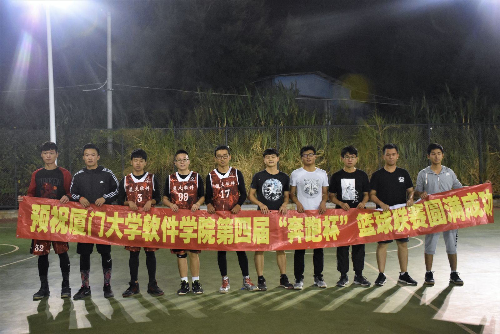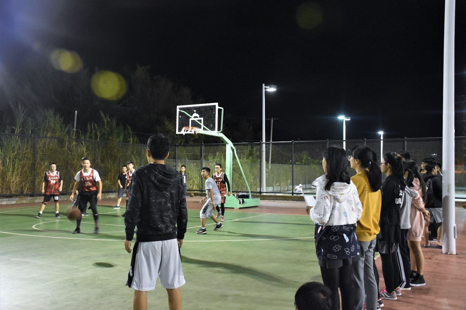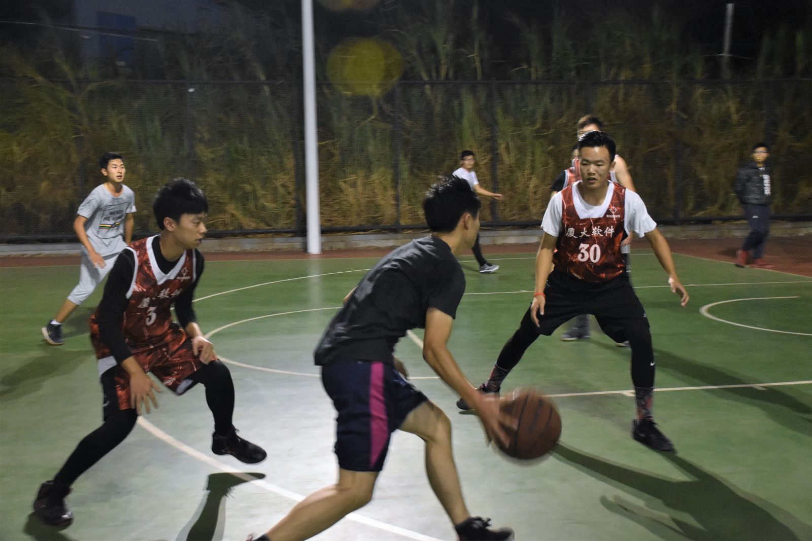 晚上七点半,随着一声哨响,篮球赛拉开帷幕。双方进行跳球,大二三班获得了首攻机会,大一四班也不示弱,稳稳地防下了第一个球。队员们热情高涨,只见双方控卫以矫健熟练的动作运球传球,有序地组织进攻,同时也不忘牢牢防守。 半场激烈角逐后,大二三班以微弱优势领先。