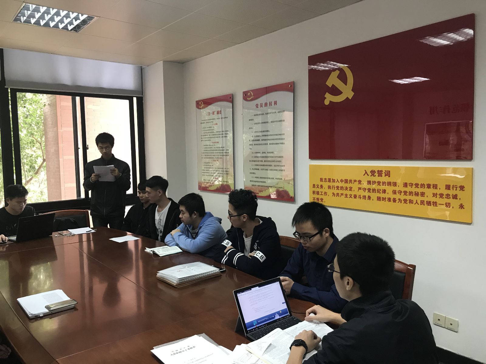 按照流程,陈东东同志宣读了入党志愿书,汇报了预备期间个人在思想态度、生活、学习、工作等方面的突出表现,表达了入党动机和加入中国共产党的强烈愿望。之后预备党员和正式党员进行建议和指正,经由正式党员表决后,同意接收陈东东同志为预备党员,考察期为一年。参与大会的同志认真对待每一个环节,整个会议过程中气氛严肃认真。大会最后,所有党员在党旗下进行了宣誓,向党组织做出了郑重的承诺。