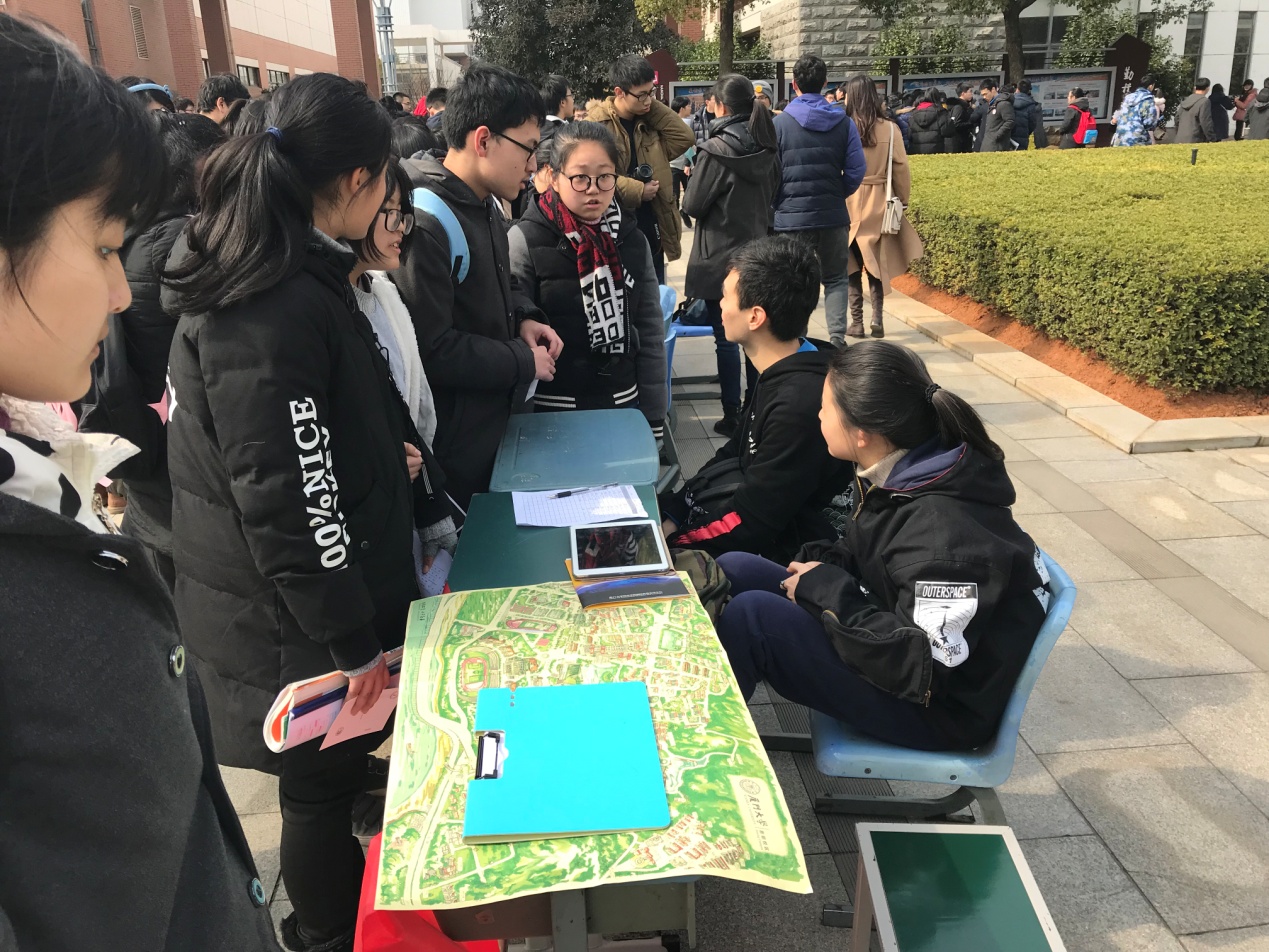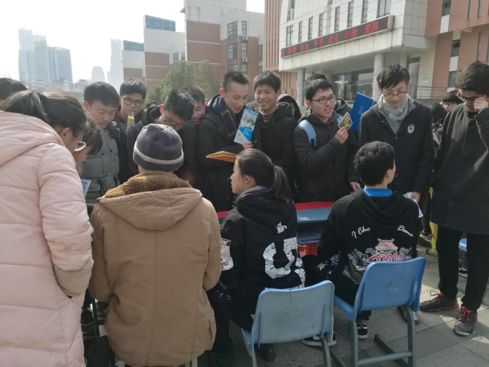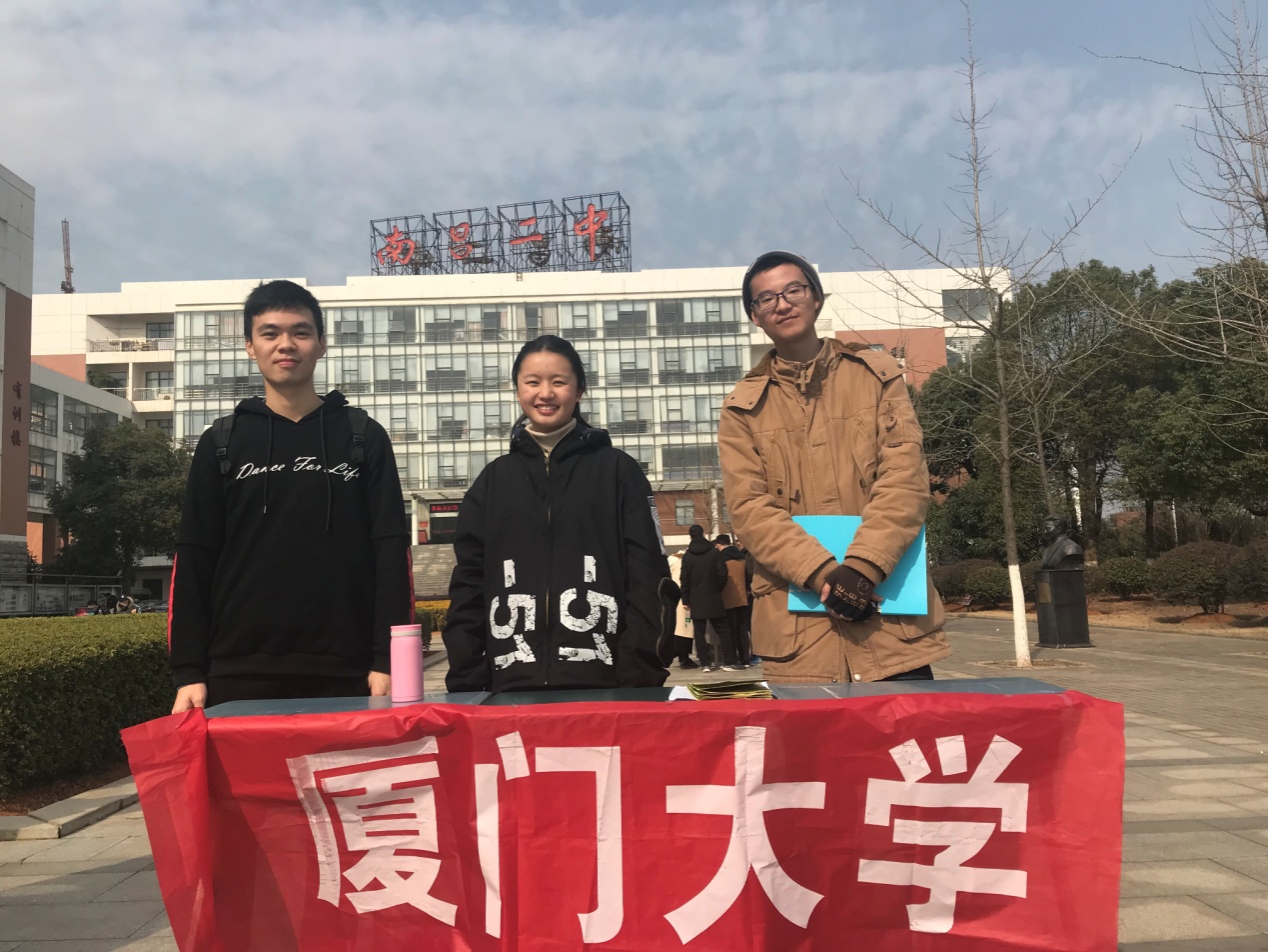 2018年2月2日中午,实践队于南昌二中院士广场举办招生咨询会,厦门大学摊位主要负责人有17级软件学院朱梓杰,17级马校软件学院孙锐涛,16级人文学院吴子康,16级经济学院陈栎安。宣讲团队主要通过答疑形式来进一步向二中学子介绍厦大,并且记录下了部分有意愿同学的联系方式。