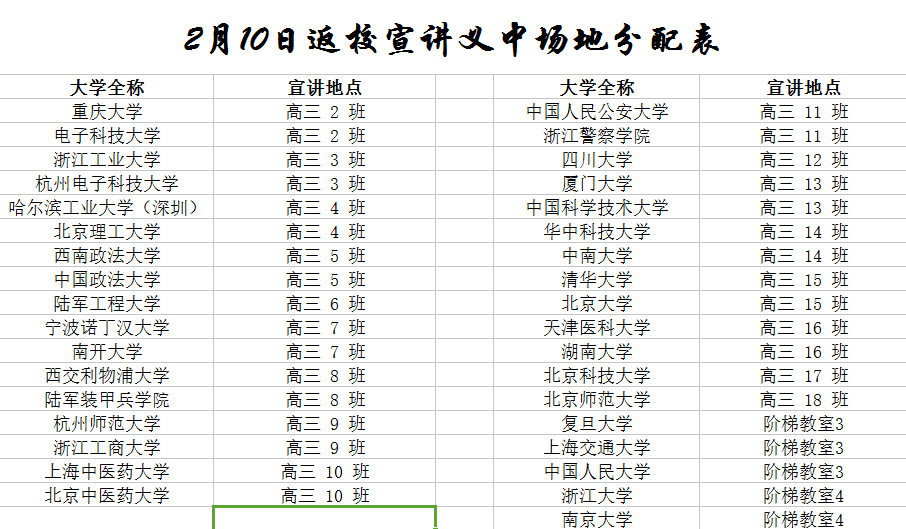 2018年2月10日上午10点,随着校长讲话的结束,义乌中学高三年级学子也总算迎来了寒假。离校前的最后一件事,便是参加大学的宣讲会。学弟学妹们选择了自己钟意的大学,按照图一的安排,前往相应教室。