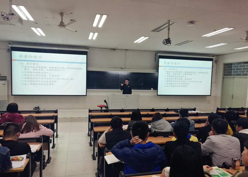 汤凯、游侯杰、常庆等3位同学分别被厦门航空、华为深圳研究院、花旗软件录用,他们紧紧围绕就业相关的准备工作、面试过程与大家分享了成功经验,特别提醒大家要做好大学四年的规划,在学好专业课的同时一定要多做项目,多参加课外竞赛,多到软件公司实习,切实提高自己的动手实践能力