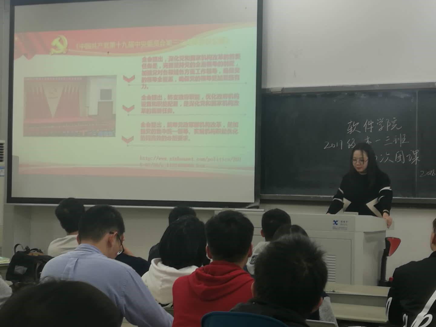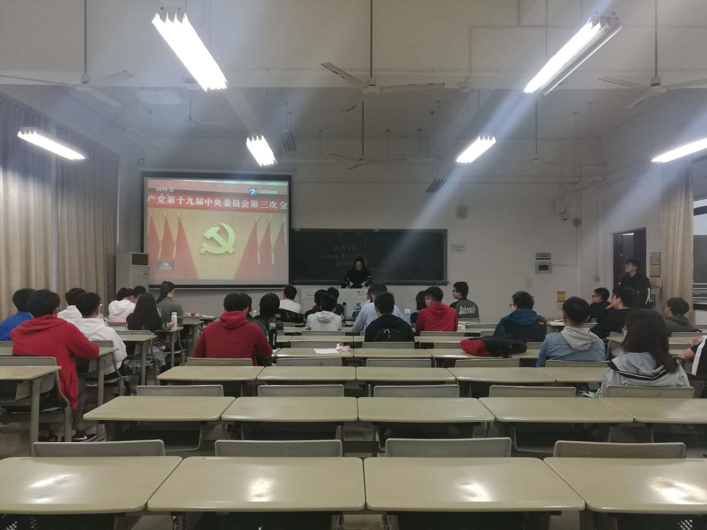 下午4点40分,厦门大学软件学院大一三班全体同学在海韵教学楼304集合。首先,团支书肖品彤组织同学们观看党的十九届三中全会的视频。视频内容有中共中央关于深化党和国家机构改革的决定,中国共产党第十九届中央委员会第三次全体会议公报以及中华人民共和国宪法修订案。同学们认真观看,深入学习相关内容。