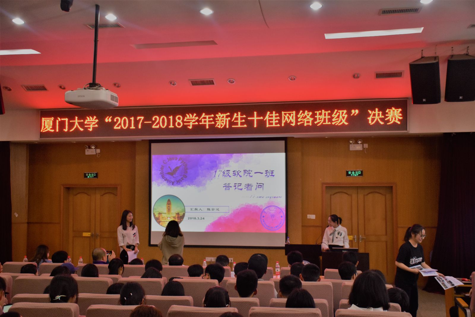 3月24日下午两点,厦门大学“2017-2018学年新生十佳网络班级”决赛在化学报告厅204如期举行。二十个班级在此进行角逐,争取十个宝贵名额。该活动从去年线上比拼,至今已经经过了三轮的淘汰赛,软件学院本科2017级一班和2017级三班以优秀的成绩进入了决赛。