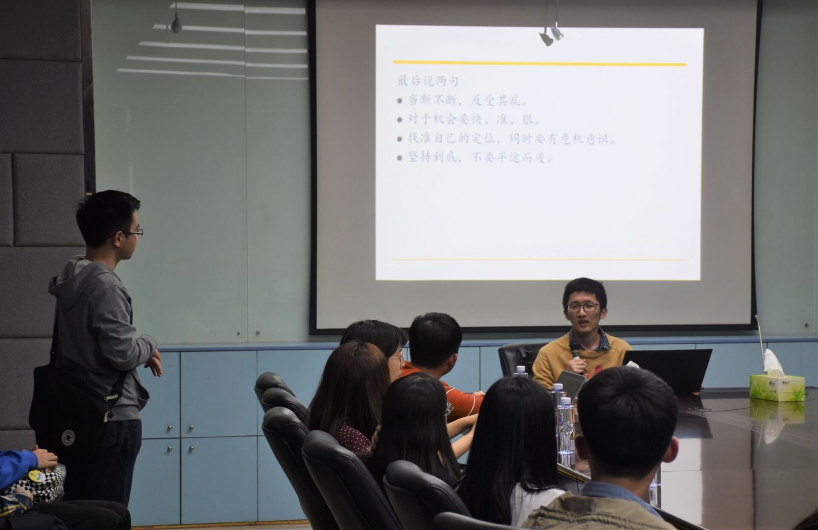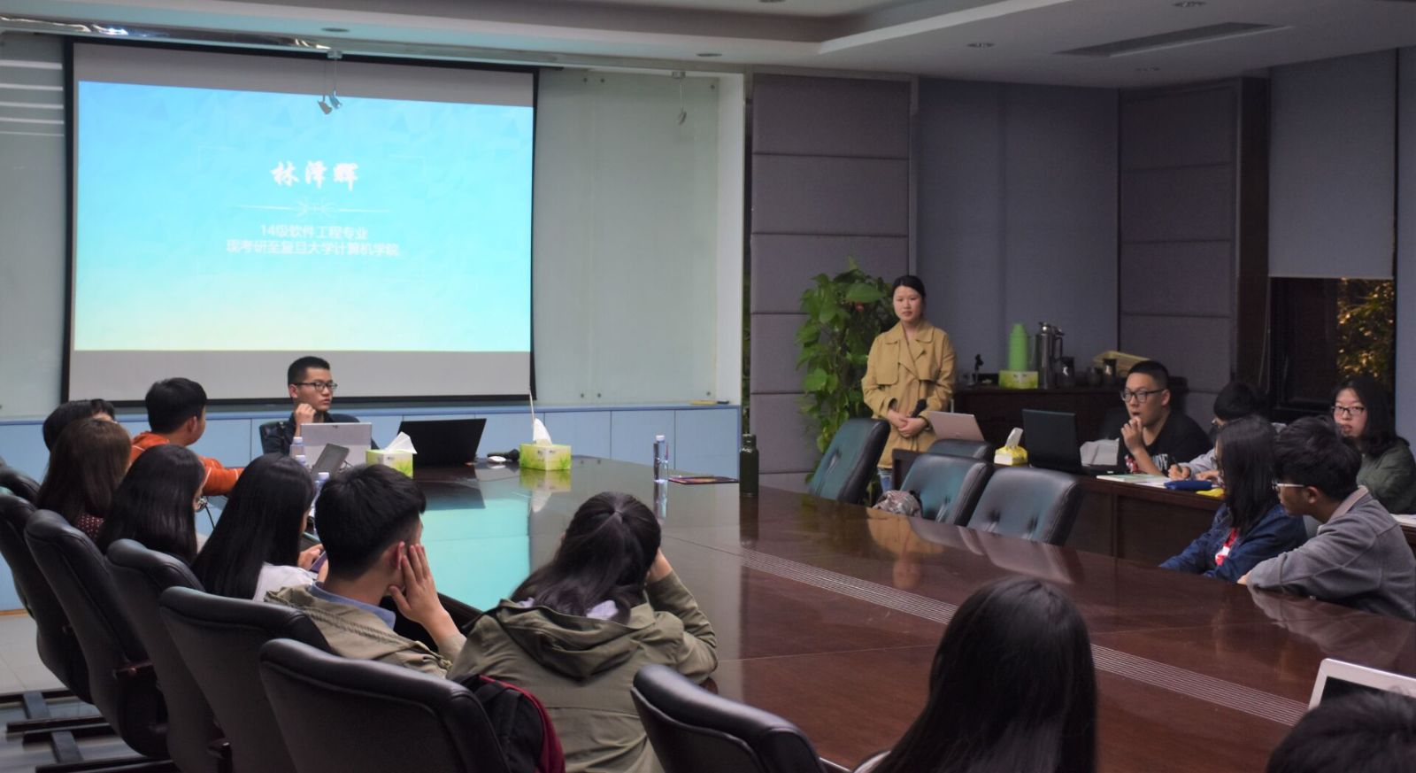 最后一位进行分享的是沈妍君学姐,她被保研至同济大学设计战略与管理专业(设计学)。她分享了她9个月跨专业求学路上的经验与教训,主张同学们应该根据自身的特点选择合适的道路,不要复制别人的成功。在分享会最后的答疑环节,同学们仍抓住机会向学长学姐面对面咨询提问,受益匪浅。