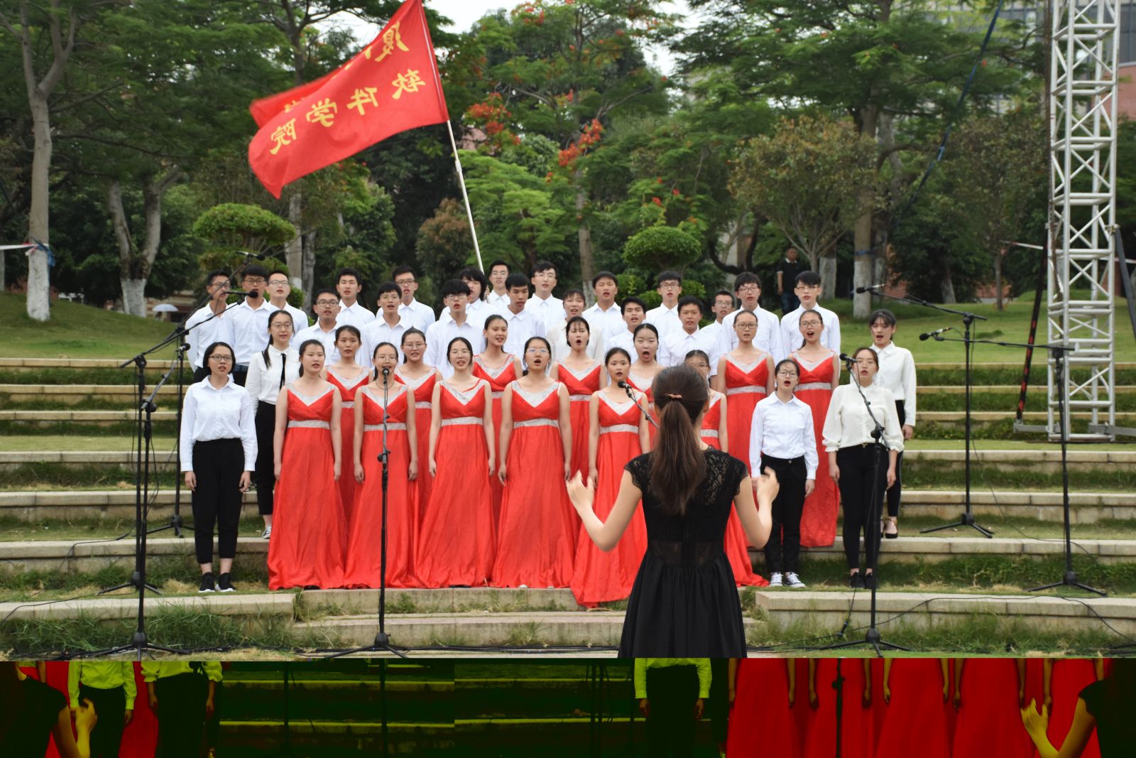 同学们身着正装,面带微笑,在舒缓的音乐声中开始了《我爱你,中国》的演唱,用歌声诉说着对祖国的热爱,感染了在场的每一个人。第二首《我们的生活充满阳光》相较第一首歌则显得更加青春活泼,在高昂的曲调里,同学们意气风发,天空飘下的雨滴掩盖不了同学们演唱的热情。演唱结束后,在场的观众献上了热烈的掌声。