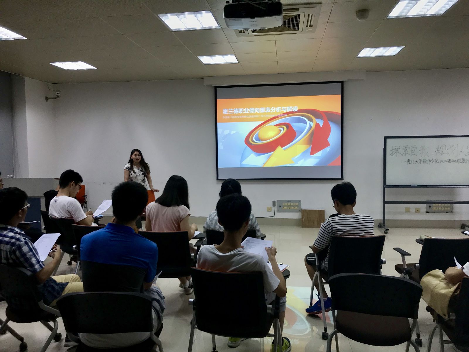 张老师从高考填报志愿入手,详细介绍了兴趣的含义和分类,接着,详细分析了霍兰德职业倾向量表的具体构成以及相对应的六种兴趣类型:现实型、研究型、艺术型、社会型、企业型、常规型。针对在场同学完成的量表情况,张老师也给出了解读。“兴趣+能力+社会需求=理想工作”张老师希望能通过这次分享,能帮助同学们更好的明确个人兴趣,探索适合工作类型,早做职业规划。同学们也纷纷表示收获良多,通过量表测试更好的认识自我,对职业规划有了新的认识。