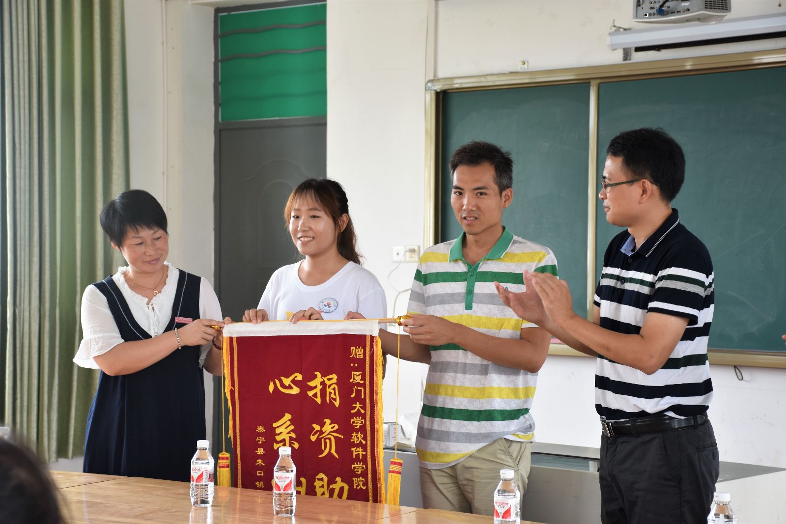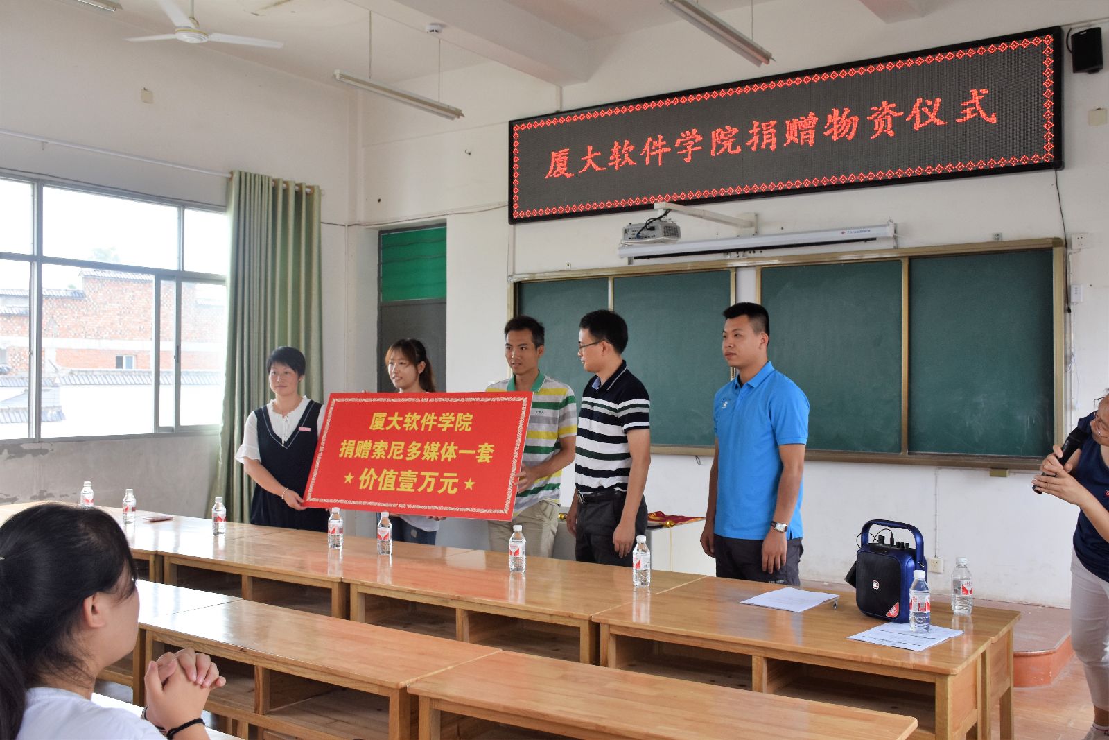 小学校长代表学校和朱口镇,接收了索尼多媒体教育教学设备套装和200套服装。同时,朱口镇第一中心小学还向厦门大学软件学院回赠写有“捐资助教,心系山区”的锦旗,表达感激之情。