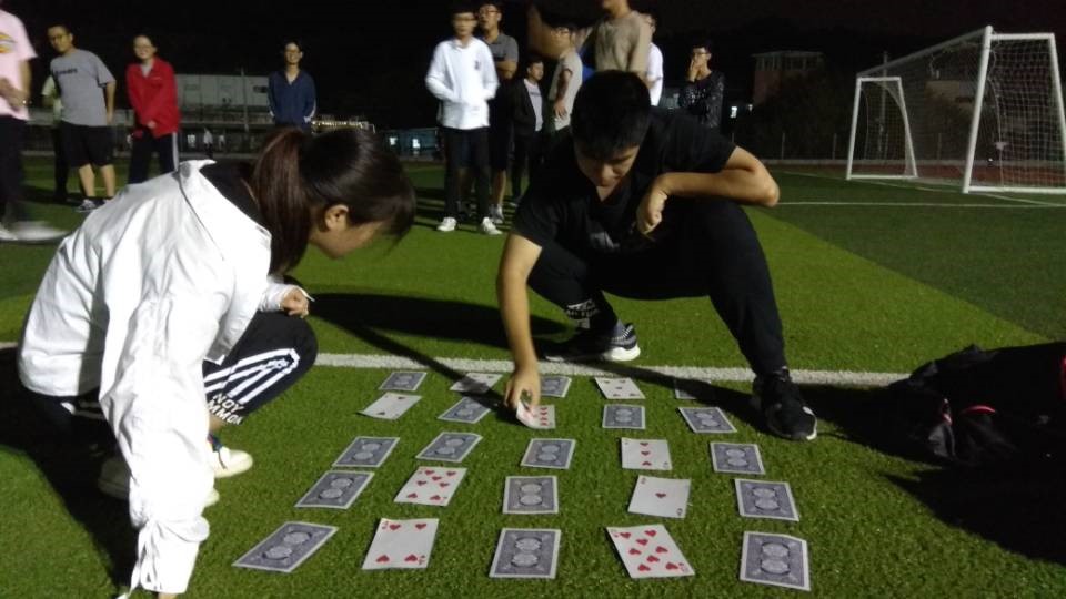 傍晚的厦大很美,同学们满怀期待又有些紧张地来到了操场上。在一会闲聊过后,活动便正式开始。学姐带我们一起玩了四个游戏,首先是“你家有几口人”,大家在一个放松愉悦的氛围中很快进入了这个美妙的夜晚。之后进行的是“翻纸牌记数字”,这的确是一个考验teamwork的游戏,两队的同学一起商量战术,井然有序,分工明确,充分展现出二班同学们的团结一致。