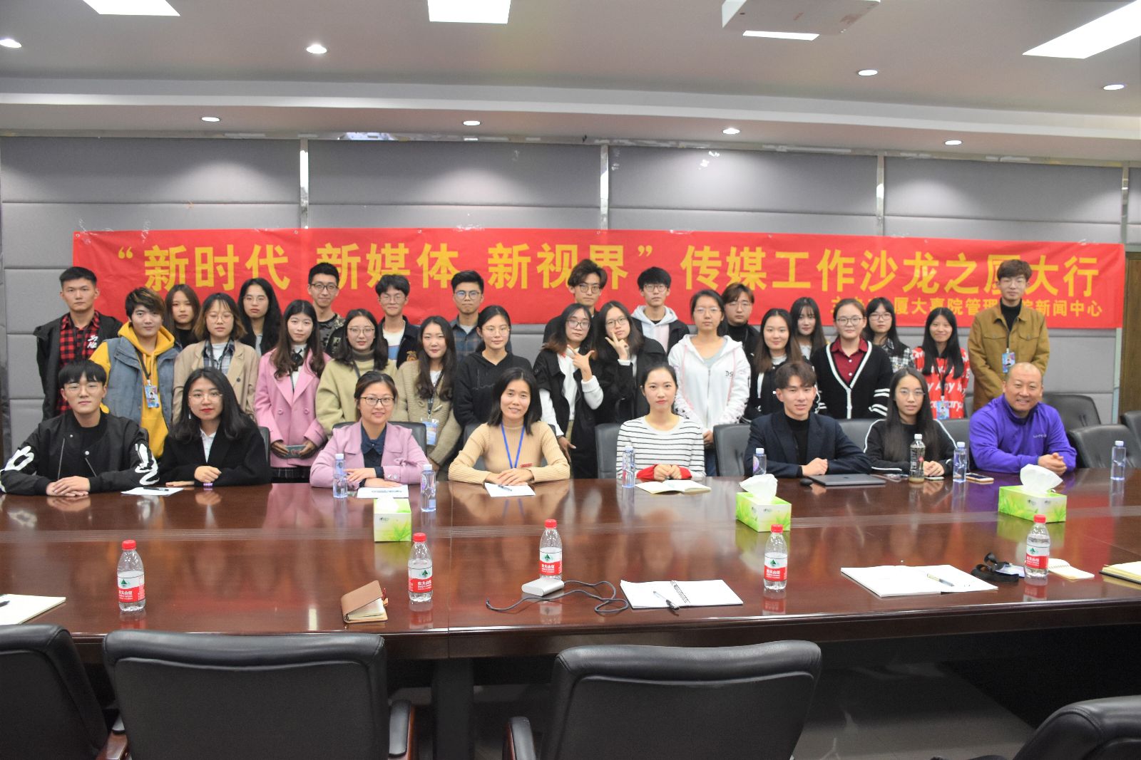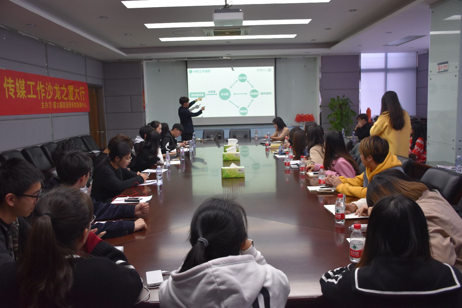 12月14日下午14点,由厦门大学嘉庚学院管理学院新闻中心主办的“新时代,新媒体,新视界”传媒工作沙龙之厦大行在海韵行政楼A306顺利开展。厦门大学嘉庚学院管理学院辅导员兼新闻中心指导老师林艺真,厦门大学数学科学学院团委书记陈向柳、辅导员陈淑铌,厦门大学软件学院辅导员刘茜以及厦门大学嘉庚学院管理学院新闻中心、厦门大学数学科学学院宣传中心、厦门大学软件学院宣传中心的全体干部共同参与了这次工作沙龙。