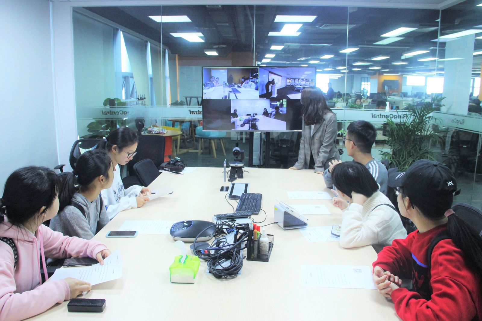 下午三点,同学们到达公司后,负责人热心地接待了大家。首先,同学们被分成两组,在不同的会议室通过铃盛的meeting会议系统和在对面房间的经理进行远程交流。在对公司的业务领域及合作范围有了大致了解后,大家通过屏幕开始了“比手画脚”的小游戏。一时间气氛活跃,大家在积极参与的同时更是增进了对公司产品的了解。