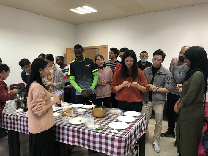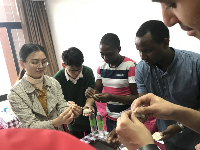 随后,在国内学生的指导下,留学生们认真地学习了包饺子的方法和技巧,互相交流着心得经验,现场温馨而充满暖意。