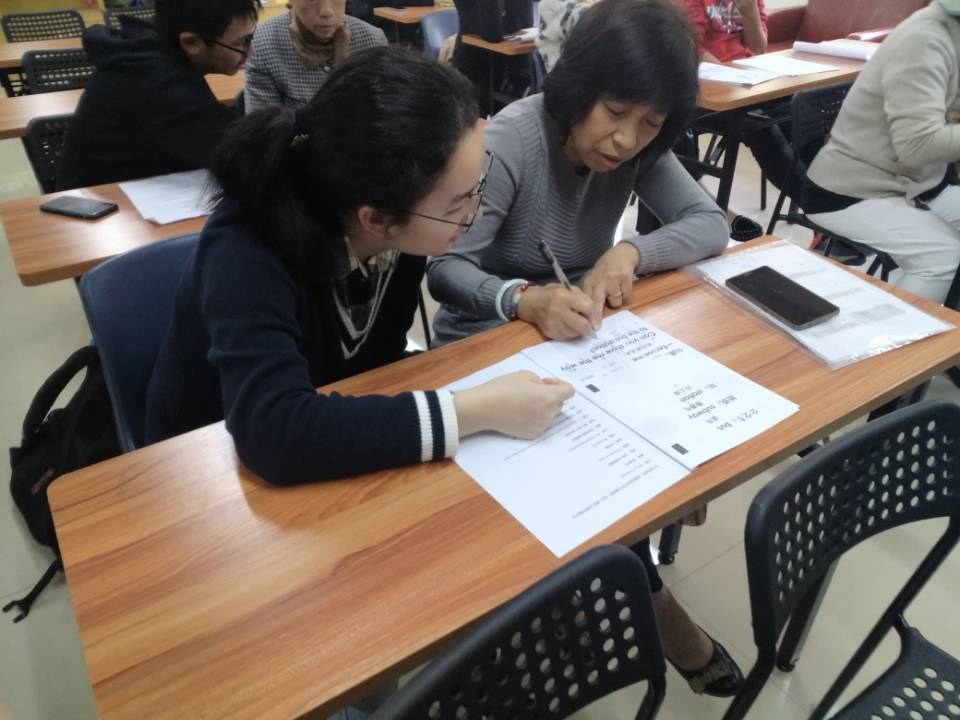 下半节课以志愿者的一对一教学为主,进行对上半节课内容的巩固和新的对话教学。首先,由两位志愿者表演场景对话的内容,这种方式能帮助老人更好地理解所学的内容该如何应用在日常生活当中,让老人有身临其境之感。随后,一对一辅导阶段正式开始。志愿者会用汉语音译来帮助老人记忆,尽量纠正他们的发音。
