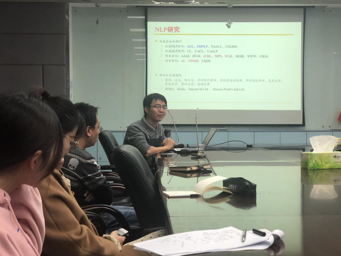 活动伊始,苏老师分享了自己早年在中科院计算研究所的求学经历。他说计算所良好的科研氛围是帮助自己在科研之路坚持下来的重要因素。随后,苏老师分享了他在自然语言处理领域所做的研究及论文发表历程,他从为什么要做科研以及如何做好科研切入,和同学们交流了选题、论文阅读、实验、论文撰写四个方面的问题。苏老师强调,要有一个好的选题,在平时的学习生活中要大量地阅读论文,积累丰富的经验,找到自己的兴趣点。如果是新手,需要找有经验的学长和老师进行请教,要充分利用团队的科研积累。除此之外,苏老师还从基础层面和应用层面上向同学们介绍了NLP研究的现状,分享了国内外权威会议期刊及知名课题组,为同学们提供了NLP领域的学习资源。
