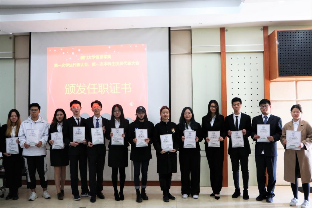 大会在庄严的国歌声中开幕。大会全体代表听取并审议了原信息科学与技术学院第十四届学生会、原软件学院第十七届学生会的工作报告。报告全面地回顾了一年来两院本科生学生委员会的工作,并在总结经验的基础上,提出了今后的工作目标和主要任务。到场嘉宾为上一届委员颁发任职证书,并为石天琪等六位获得“优秀部长”称号的委员颁发荣誉证书。大会经选举产生了信息学院第一届学生委员会主席团成员。新一届学生委员会主席团成员代表王鑫上台发言。她首先对大会代表的信任表示感谢,表示将以更坚定的信念,肩负重任、精诚合作,不忘初心、继续前进,不负所托、努力拼搏,以更饱满的热情带领新一届学生委员会走向更美好的未来。