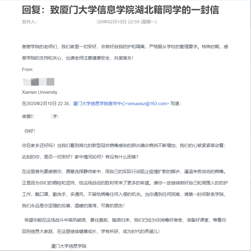 上次收到学校寄来的EMS邮件还是南方之强的录取通知书,我还记得当时的那份激动和喜悦,亦记得上面写着:“揭开这心动的一页,开启一段新的征程,南国最美丽的著名学府,用大海的胸襟和白鹭的情愫迎接你的到来,这里是无数风流人物的摇篮,光荣与梦想,托起你智慧的风帆,在未来的岁月里绽放青春的火花。”我很荣幸能成为厦大的一份子,也一直将“自强不息,止于至善”的校训牢记心中,在这个特殊的假期,我一定提高防范意识,家里也取消了所有的外出活动,严格遵守学校的规章制度,停课不停学,在这段时间里充实自己,致吾知于无央,充吾爱于无疆。